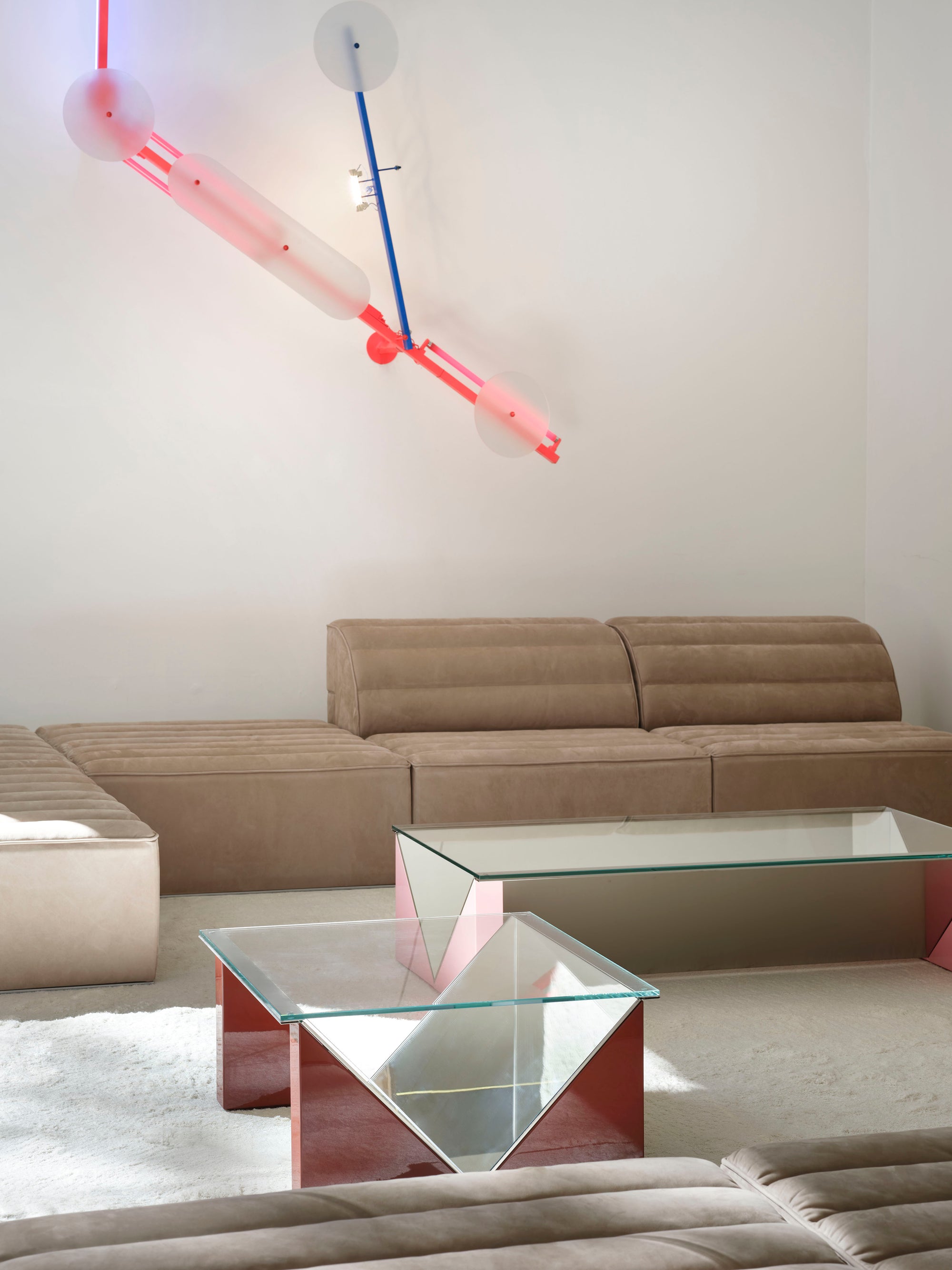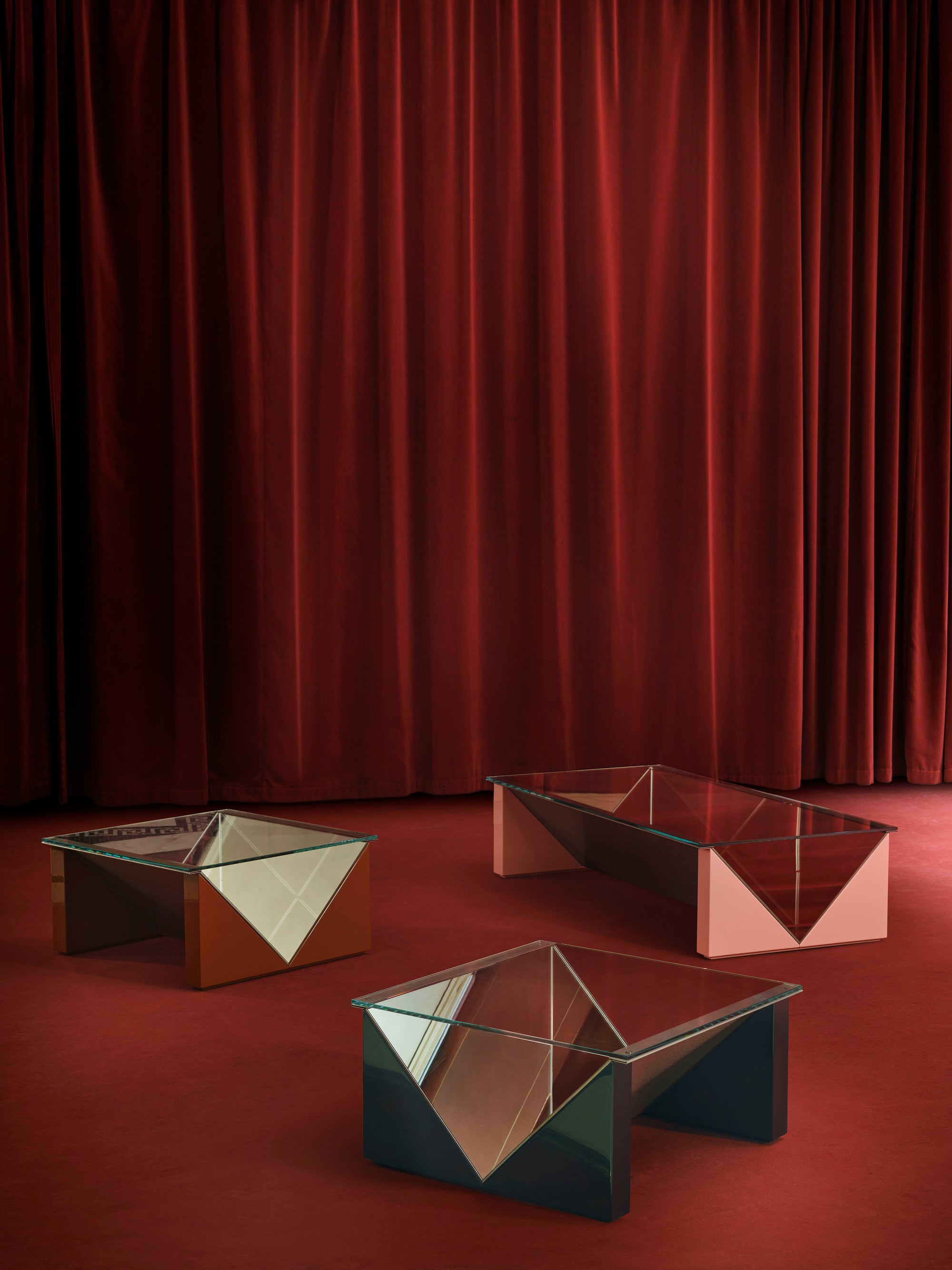 No universo das mesas de centro, Salocchi explorou estruturas geométricas em vidro temperado, jogando com transparências, cores e reflexos. As mesas Napoleone, apresentadas em 1973 na Trienal de Milão, criam um subtil efeito de espelhos e profundidade. Cinquenta anos depois, a ACERBIS relança-as em novas tonalidades, recuperando a sofisticação e o espírito experimental da época.