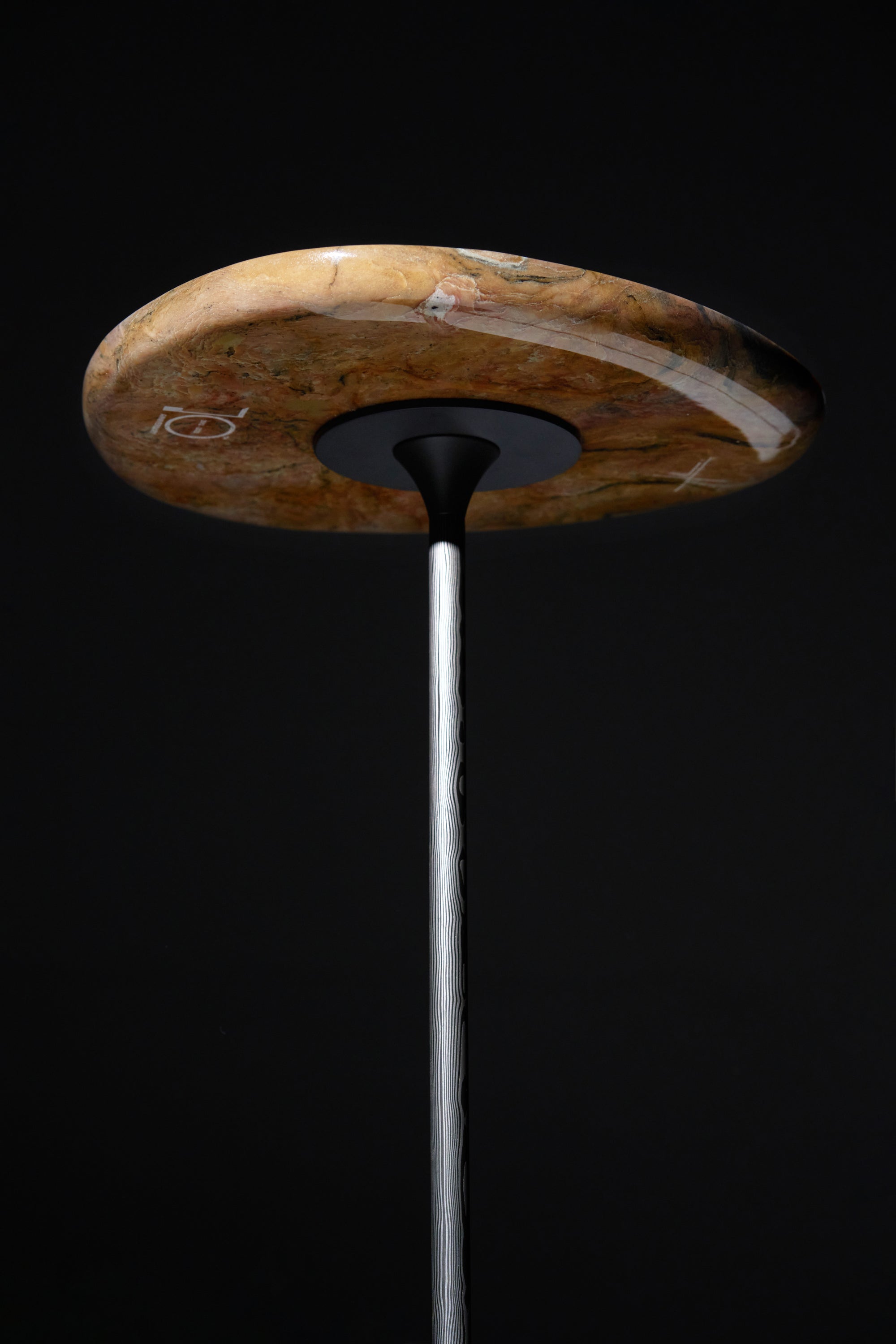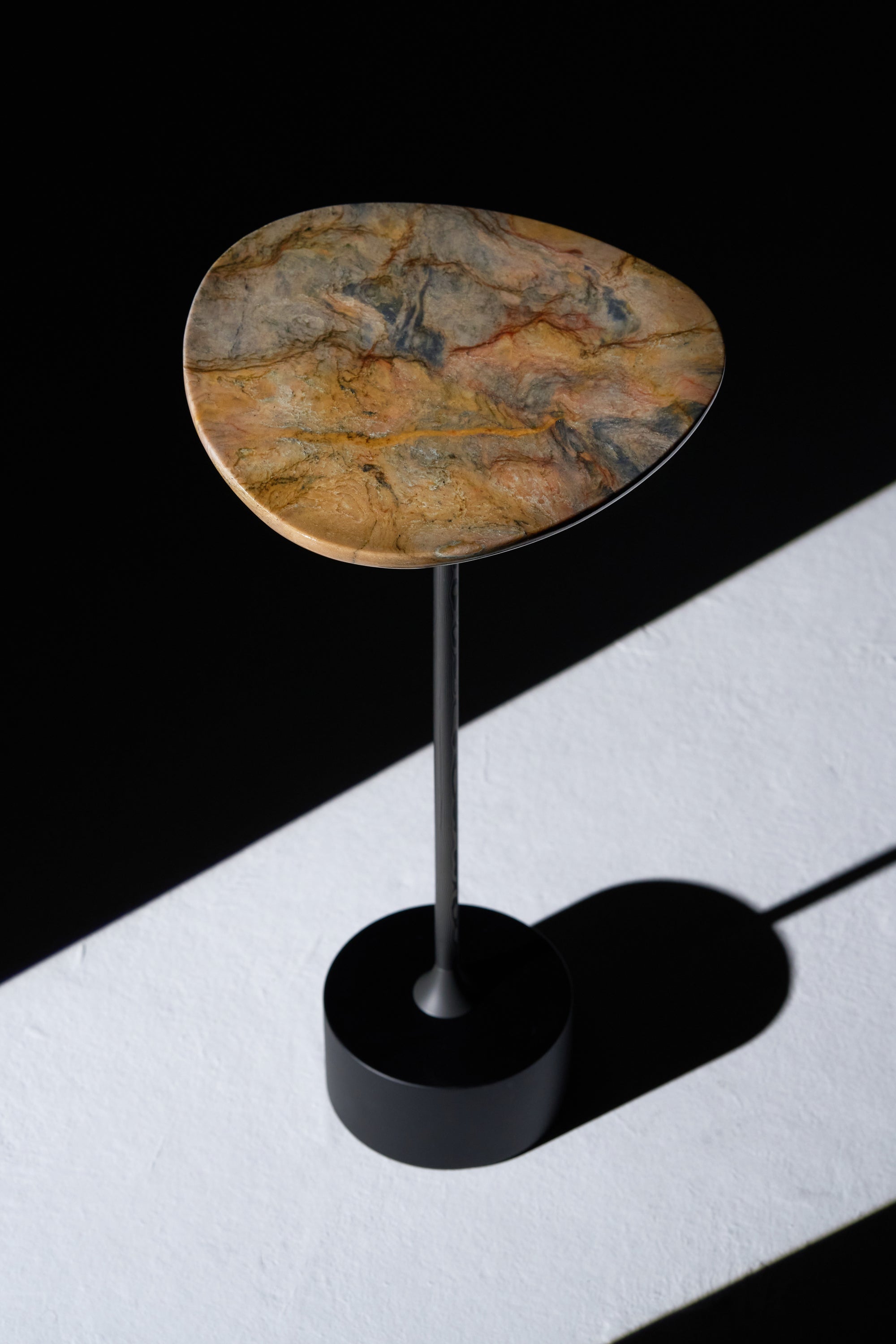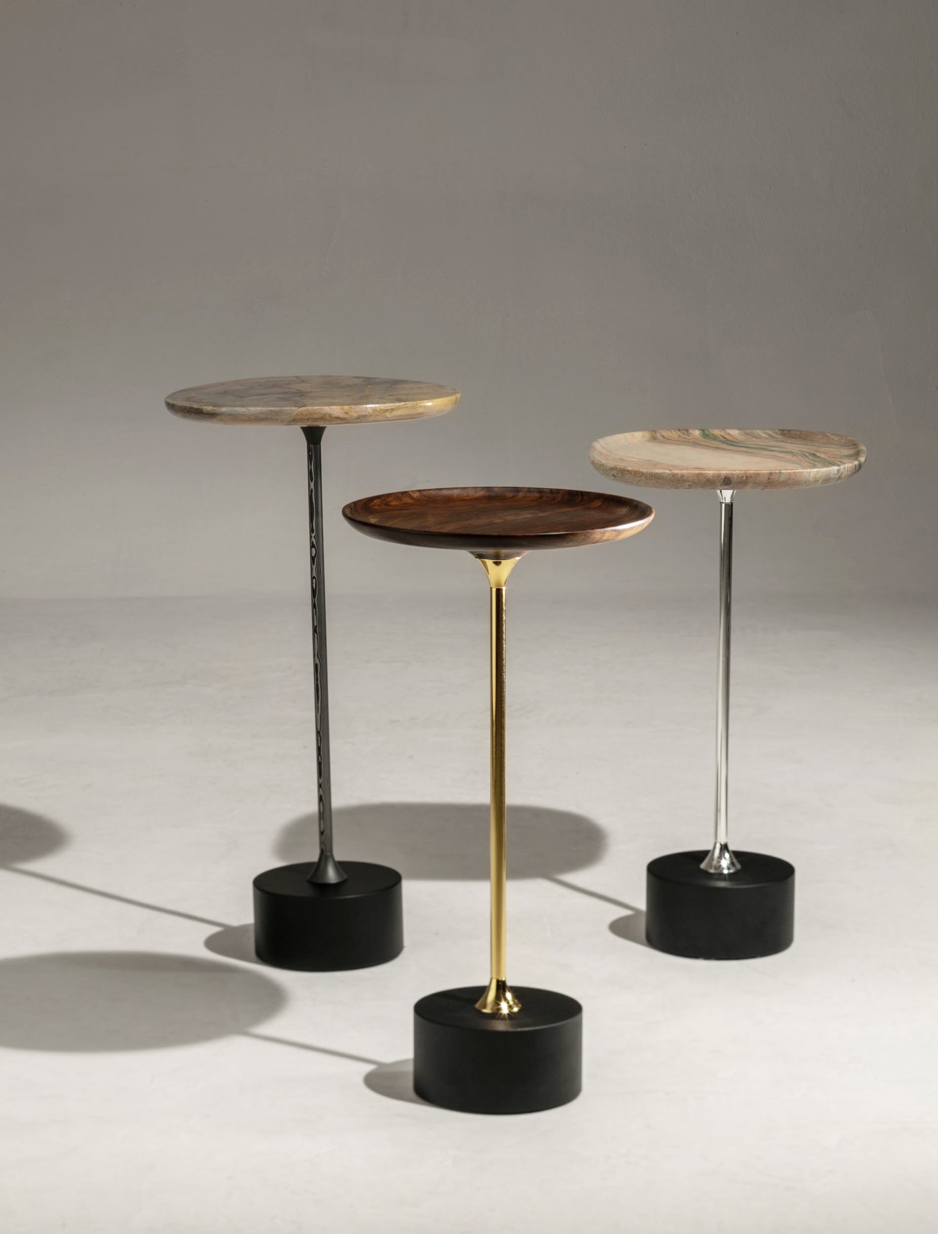 Esta coleção comemorativa introduz novos acabamentos que elevam ainda mais a identidade das peças. Entre as novidades, surge uma versão com tampo em madeira de Imbuía e pé em aço Damasco, bem como uma proposta mais luxuosa, com pé em latão e cobre. A estas juntam-se novas técnicas de polimento e texturização aplicadas aos acabamentos em mármore, que acrescentam profundidade e sofisticação ao conjunto.