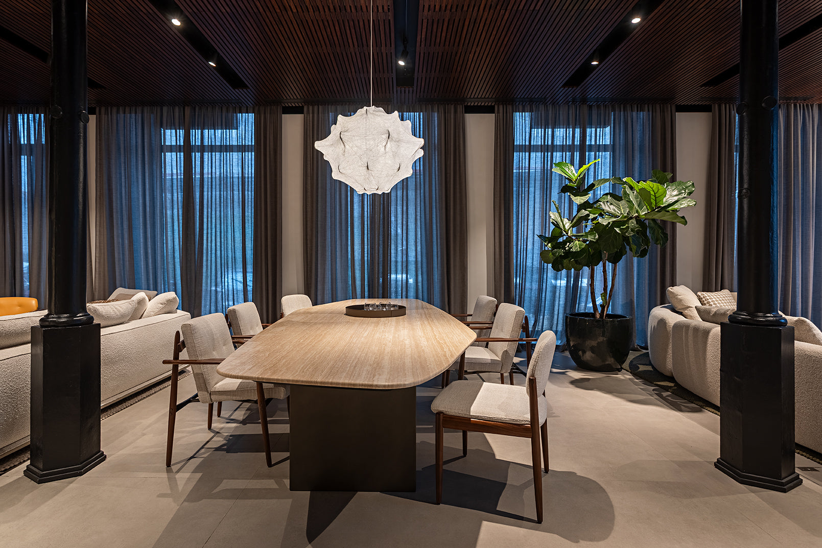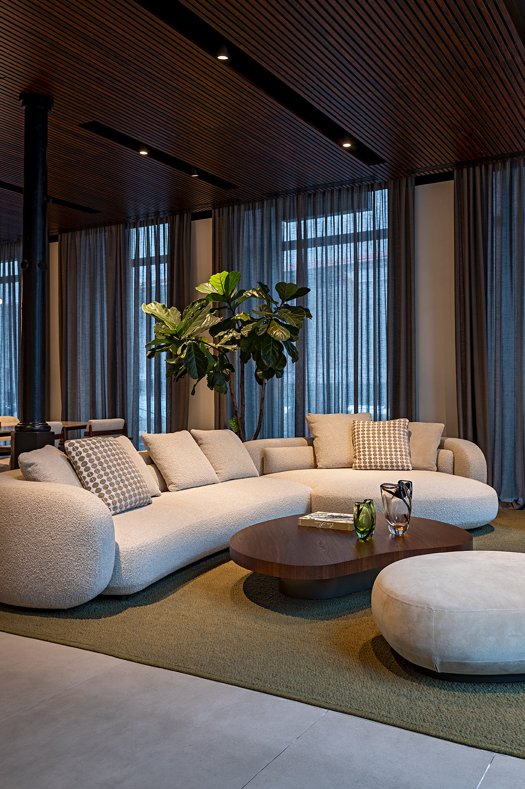 Destacam-se o sofá Bézier e a mesa de refeições Linha Livre, de Marcio Kogan / Studio MK27, a mesa de centro Andrée, de Hannes Peer, inspirada nas fachadas milanesas dos anos 70 e ainda a mesa de apoio Nastro e as poltronas Laurel, assinadas pelo italiano Giampiero Tagliaferri.