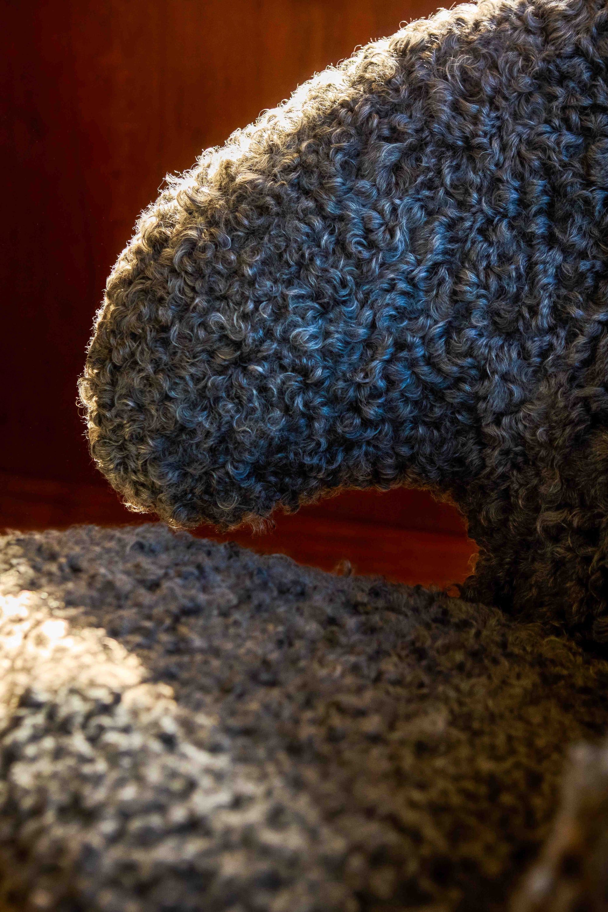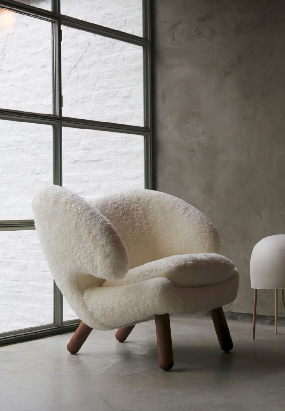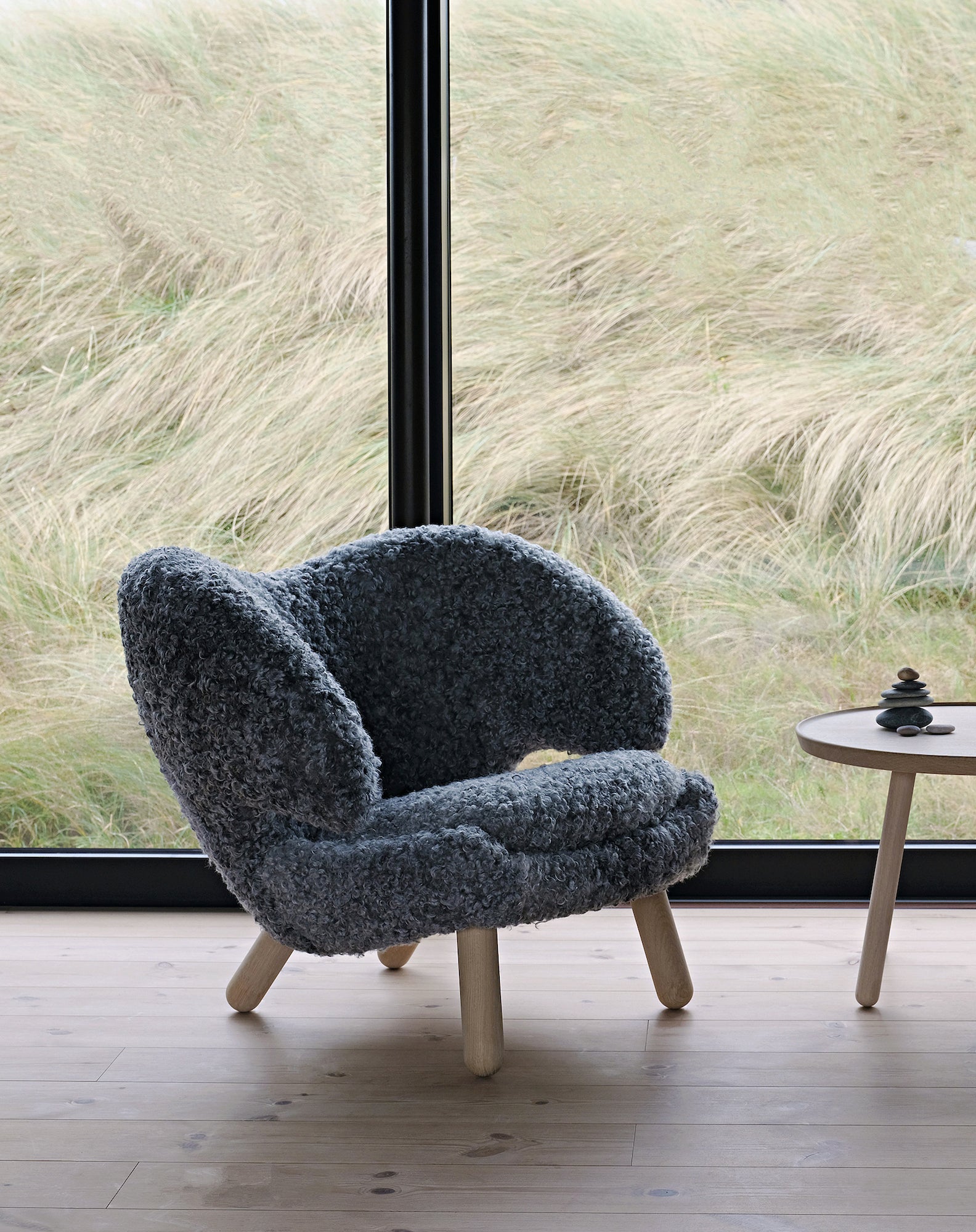 O destaque vai para a cor cinza e o pelo extraordinariamente macio e encaracolado — uma característica única de uma espécie de ovelha da ilha de Gotland, na Suécia. Foi exatamente este pelo que inspirou a HOUSE OF FINN JUHL a criar a edição limitada da Pelican Chair que agora apresentamos.