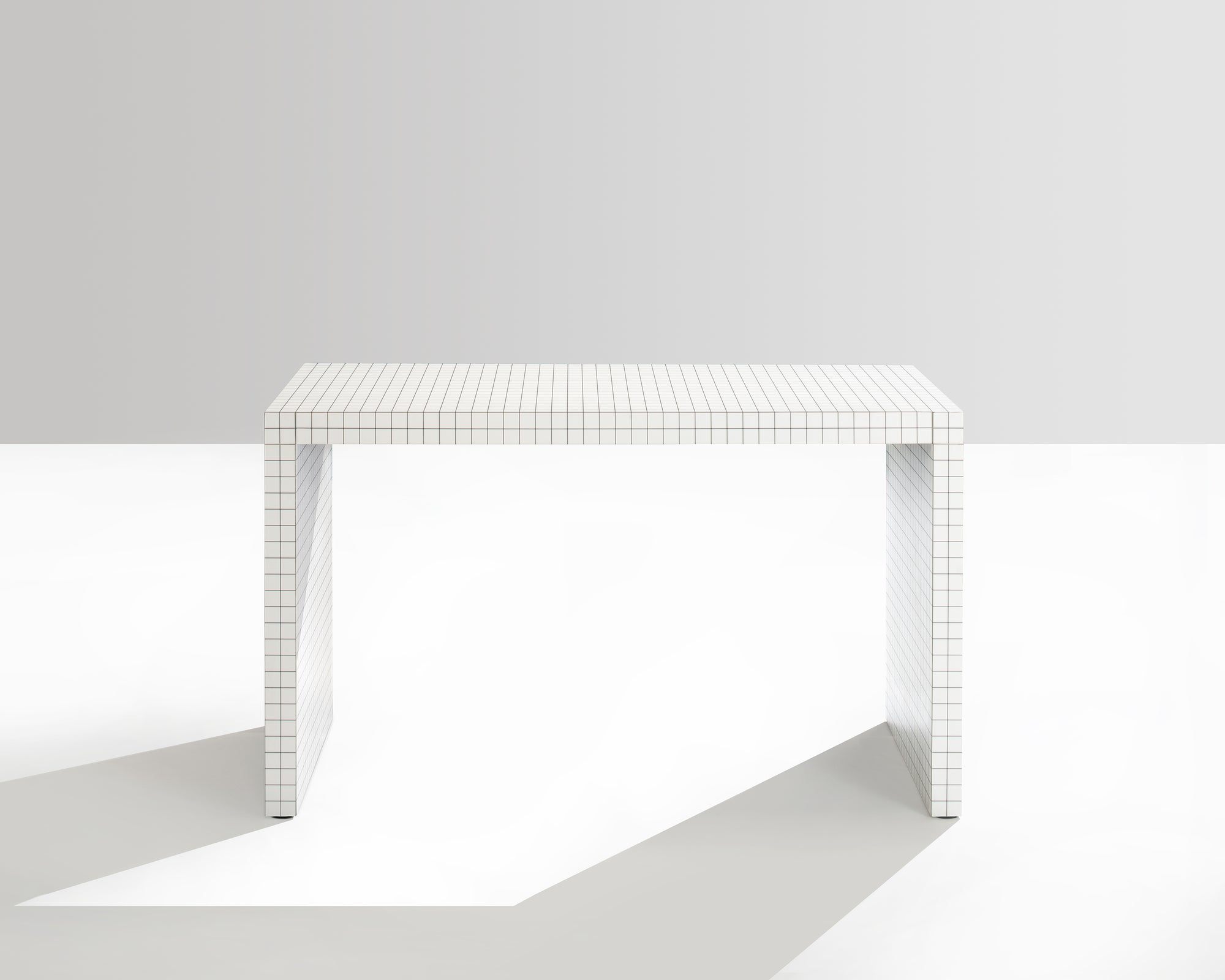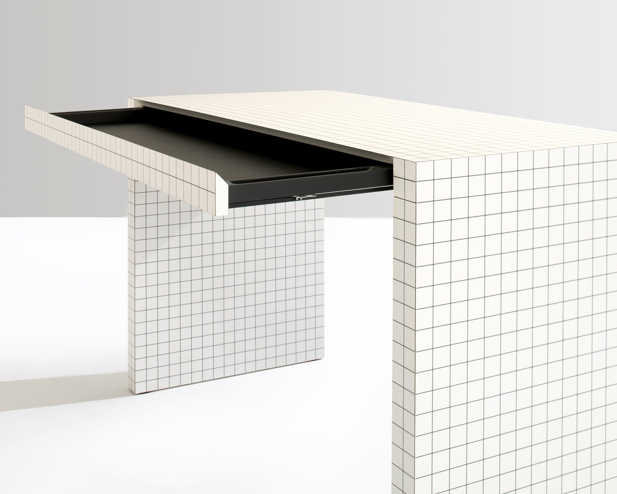Fiel à linguagem geométrica que define toda a coleção, a secretária apresenta uma estrutura em núcleo honeycomb revestida por laminado branco impresso com a icónica grelha negra de módulos de 3 cm — um padrão que transforma a peça numa verdadeira arquitetura em miniatura. A secretária distingue-se pela sua simplicidade rigorosa, onde cada plano e aresta segue a mesma lógica modular. Apesar do carácter escultórico, oferece funcionalidades discretas mas práticas, como a gaveta integrada no tampo, suficientemente ampla para acolher um portátil ou documentos de grande formato, com compartimentos dedicados a pequenos acessórios.