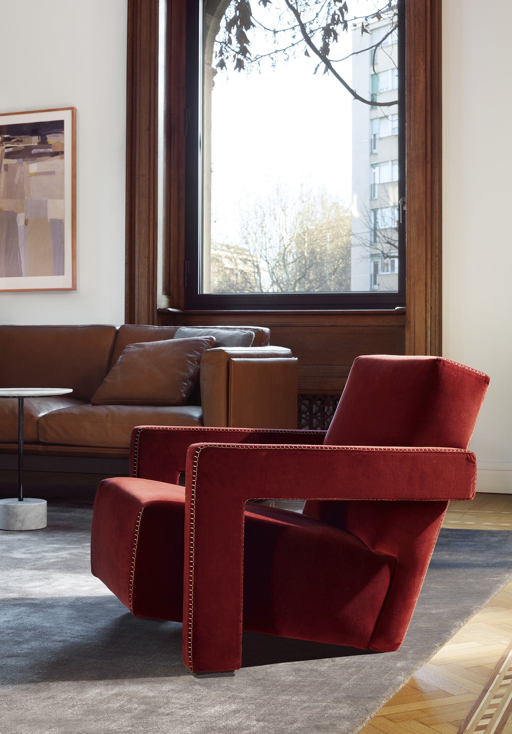 A poltrona Utrecht reflete essa mesma linguagem e está na coleção I Maestrei da Cassina desde 1988.